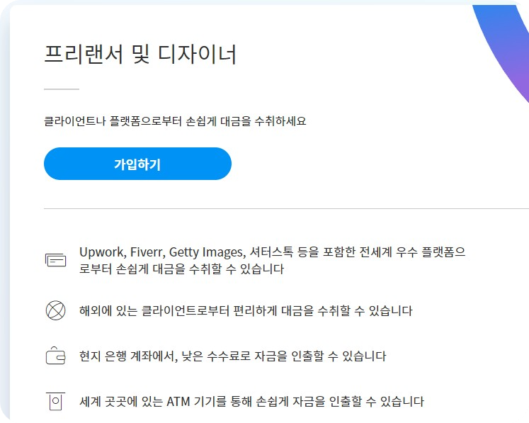 - Upwork, Fiverr, Getty Images, 셔터스톡 등을 포함한 전 세계 플랫폼으로부터 손쉬운 대금 수취