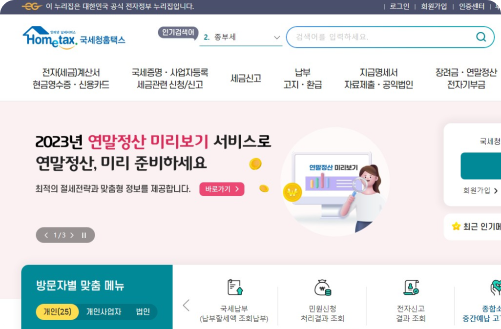 검색창에 홈택스나 홈텍스 둘 중 하나로 검색하시면 국세청 홈택스 페이지가 나온답니다.