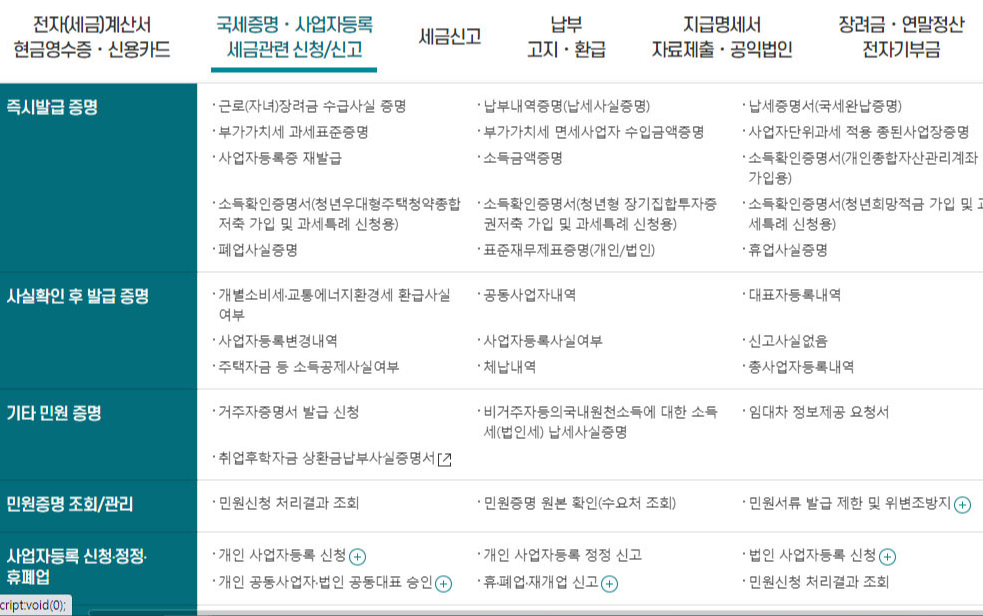 이 곳에 있는 상위 메뉴 중에, 국세증명. 사업자등록. 세금 관련 신청/신고라는 메뉴가 있습니다.