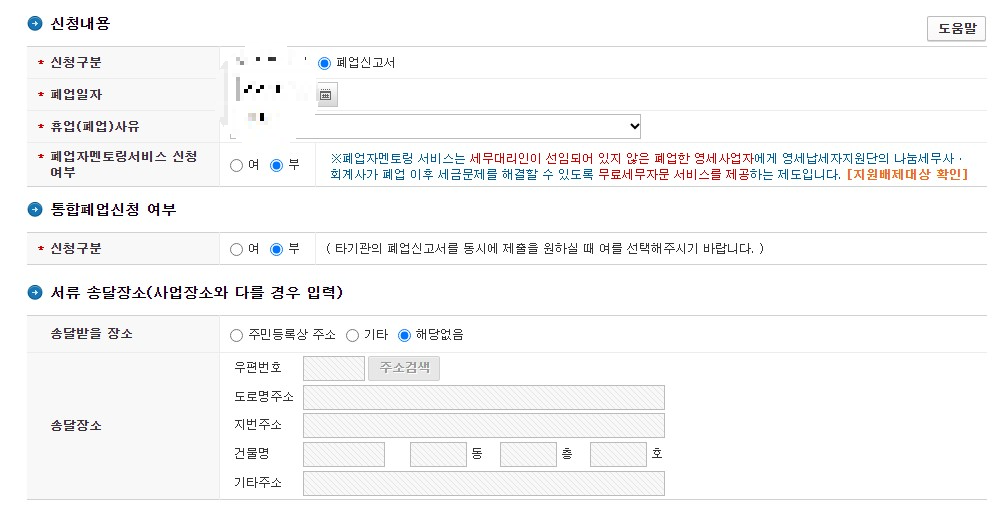 사업자등록번호를 선택하면 내가 등록한 사업자 정보가 나오는데, 폐업 신고서와 일자에 체크를 하고 신청하시면 빠르게 신청이 가능합니다. 저는 개시도 하지 않았기 때문에, 멘토링 서비스를 신청할 필요가 없었고, 통합폐업 신청여부도 부입니다. 서류 송달 장소도 해당 없음이었습니다.